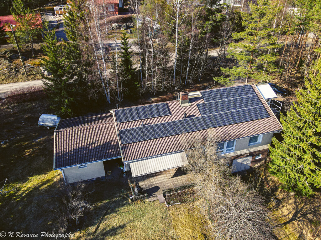 Järjestelmä koostuu 33 kpl Panasonic 335w HIT paneeleista. Kokonaisteho 11055w. Panasonic paneeli kestää hyvin kuumuutta. Paneelissa on 96 yksitäistä kennoa, jotka ovat kytketty sarjaan. Paneelista lähtevä jännite on 60 volttia. Järjestelmän invertteri on SMA 10kw. Invertterissä on 2 kanavaa toisessa 2 sisäänmenoa ja toisessa 1 sisäänmeno. Paneelit on kytketty 3 erilliseen sarjaan. Kussakin sarjassa 11 paneelia 3685w ja jännite on 660 volttia. Aurinko kun on noussut horisontin yläpuolelle, niin jokaisessa sarjassa jännite on yli 600v, vaikka paneelit eivät saa suoraa auringon valoa. Pääosa inverttereistä herää vasta, kun paneeleilta tuleva jännite on yli 180v. Järjestelmään on kytketty myös Home Manager hoitamaan automaatiota, jota ohjataan Sunny Portalin kautta.